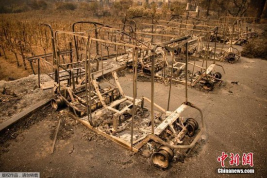 当地时间2020年9月30日,美国加州纳帕谷,蔓延速度最快的“玻璃大火”(Glass Fire)肆虐纳帕著名的葡萄酒产区,已造成3人死亡,葡萄园区遍地废墟。