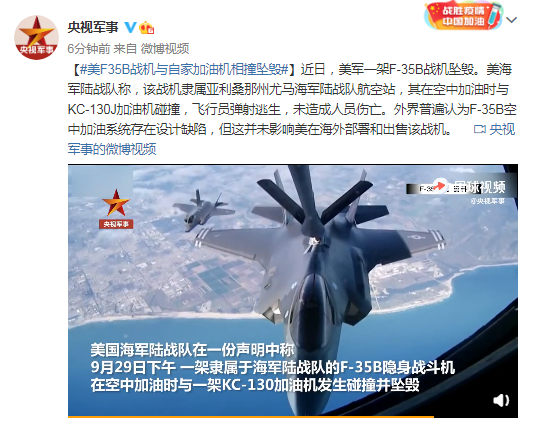 【#美F35B战机与自家加油机相撞坠毁#】近日,美军一架F-35B战机坠毁。美海军陆战队称,该战机隶属亚利桑那州尤马海军陆战队航空站,其在空中加油时与KC-130J加油机碰撞,飞行员弹射逃生,未造成人员伤亡。外界普遍认为F-35B空中加油系统存在设计缺陷,但这并未影响美在海外部署和出售该战机。