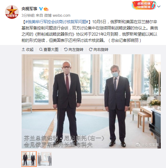 【#俄美举行军控会谈商讨核裁军问题#】10月5日,俄罗斯和美国在芬兰赫尔辛基就军备控制问题进行会谈,双方讨论集中在继续限制战略武器的协议上。美俄之间的《新削减战略武器条约》协议将于2021年2月到期,俄罗斯希望能以其以前的形式继续,但美国表示还将探讨战术核武器。(总台记者郝晓丽)
