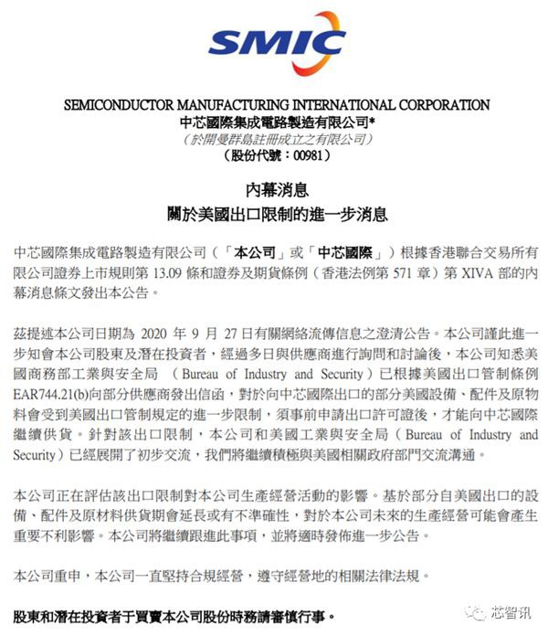 中芯国际在公告中称:经过多日与供应商进行询问和讨论后,该公司知悉美国商务部工业与安全局 (Bureau of Industry and Security)已根据美国出口管制条例 EAR744.21(b)向部分供应商发出信函,对于向中芯国际出口的部分美国设备、配件及原物料会受到美国出口管制规定的进一步限制,须事前申请出口许可证后,才能向中芯国际继续供货。