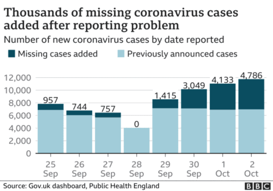 报道称,出现这个错误的原因是英国国家医疗服务体系(NHS)检测和追踪小组发送给英格兰公共卫生署(PHE)的一些微软Excel数据文件超过了文件格式最大限制。这意味着9月25日至10月2日期间,有15841例病例没有被列入在英国每日新增病例统计数据之内。