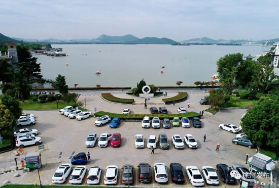 金山塔下出游车辆有序停放。