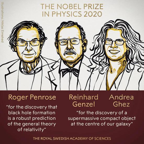 刚刚,2020年诺贝尔物理学奖揭晓。英国理论物理学家罗杰·彭罗斯(Roger Penrose)与德国天文学家赖因哈德·根策尔(Reinhard Genzel)、美国天文学家安德莉亚·盖兹(Andrea Ghez)分享了今年的奖项。其中,彭罗斯因为发现黑洞的形成是对广义相对论的有力预测而被授予诺贝尔物理学奖;根策尔与盖兹的获奖理由是他们发现了银河系中央的一个超大质量致密天体。值得一提的是,斯蒂芬·霍金与彭罗斯合作完成了奇点理论等工作,但霍金于2018年去世,因而可能遗憾错过了诺贝尔奖。
