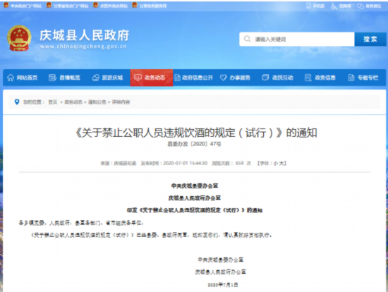 今年7月,甘肃环县印发了《关于禁止公职人员饮酒的规定(试行)》的通知,要求全县公职人员一切公务活动禁止饮酒。