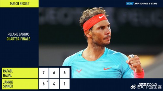 中新网10月7日电 法国网球公开赛男单1/4决赛于北京时间7日结束了两场争夺。其中纳达尔面对辛纳,在首盘化解发球胜盘局后,前者以7:6(4)/6:4/6:1完胜,生涯第13次打进法网四强。值得一提的是,这是纳达尔在罗兰加洛斯的第100场比赛,拿到的第98场胜利。