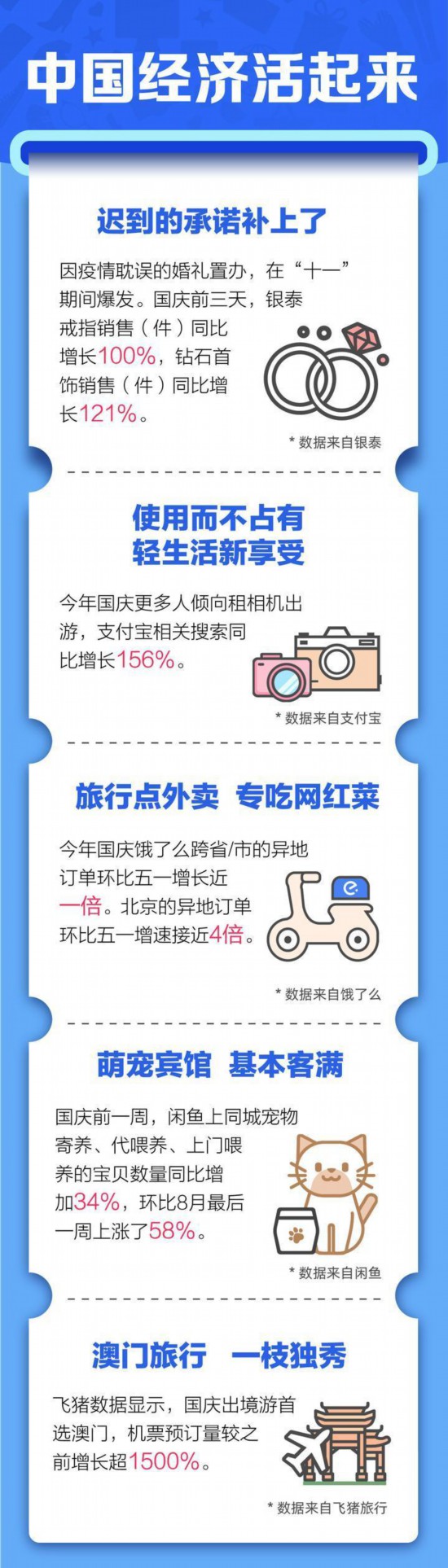 10月6日,《阿里巴巴2020“十一”假期消费出行趋势报告》发布。报告显示,疫情后的第一个大长假呈现三大趋势:团圆成主题,家人聚起来;出游高涨,大家动起来;消费情绪旺盛,中国经济活起来。2020年已经过去大半,人们终于迎来了第一个“像样”的长假。