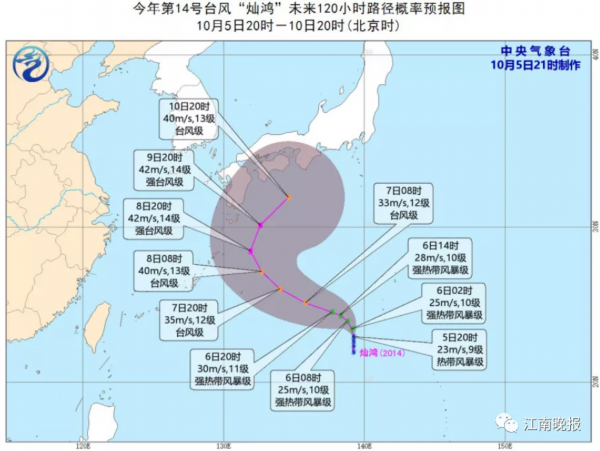 预计,“灿鸿”将以每小时10公里左右的速度向偏北转西北方向移动,强度逐渐加强,最强可达台风级到强台风级(13-14级,40-45米/秒),逐渐趋向日本西南部附近海面。