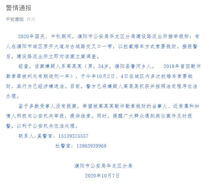经查,该案嫌疑人系高某某(男,34岁,濮阳县鲁河乡人, 2018年曾因敲诈勒索罪被判处有期徒刑一年),于今年10月2日、4日在城区内多次拦婚车索要钱财,其行为已经涉嫌违法。目前,警方已将嫌疑人高某某抓获并按照法定程序依法办理。