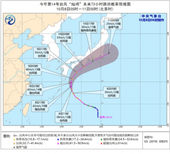 预计,“灿鸿”将以每小时15-20公里的速度向北偏西转北偏东方向移动,强度继续加强,最强可达台风级或强台风级(13-14级,38-42米/秒),并向日本九州岛南部海面靠近;9日白天将在日本九州岛南部海面转向东北方向移动,强度逐渐减弱,登陆或擦过日本本州岛南部沿海后,移入日本以东洋面,变性为温带气旋。