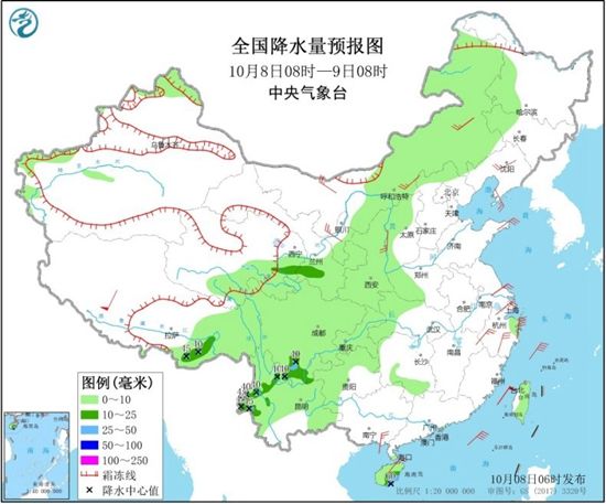 中央气象台预计,新疆北疆北部、青海东南部、内蒙古东北部等地的部分地区有小到中雪或雨夹雪;西藏东部、内蒙古中东部、西北地区东部、西南地区大部、海南岛、台湾岛等地的部分地区有小到中雨,其中,四川西南部、云南西部、西藏东南部、海南岛东南部等地局地有大雨或暴雨(50~60毫米)。