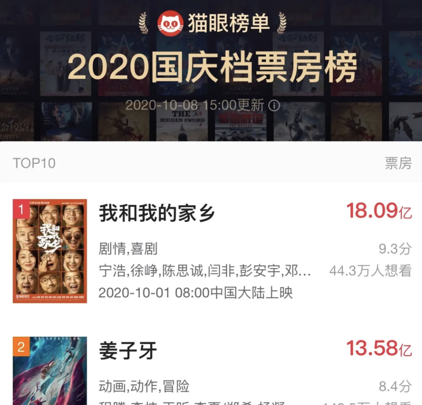 截至10月8日下午3点,数据显示,电影国庆档票房已经突破了37亿。虽然相比去年国庆档7天创下的44.6亿票房有所下降,但由于今年电影业受疫情影响,经历了大半年的沉寂,这个成绩可以说已经相当令人满意,甚至是惊喜。