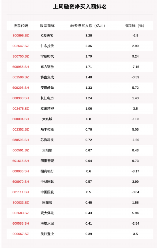 9月28日至9月30日两市共有330只个股有融资资金净买入,共有0只个股净买入金额超10亿元,其中C爱美客、仁东控股、宁德时代排名前三,买入金额分别为3.28亿元、2.36亿元、1.79亿元。