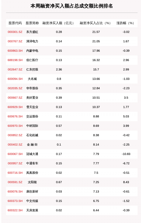 两市共有9只股票融资净买入额占总成交金额比例超10%,其中东方盛虹、漳泽电力、内蒙华电排名前三,占比分别为21.57%、21.05%、17.96%。