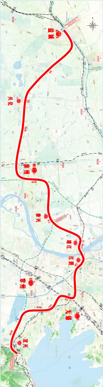 泰州段线路长度145.9km,其中——兴化段长度59.8km、泰州市区段长度为29.0km、泰兴段长度为37.4km、靖江段长度19.7km,拟设安丰、兴化、周庄镇、泰州南、泰兴、靖江东6个站。