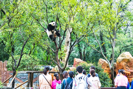 大熊猫“捞捞”和“月亮”就一直是景区最亮的动物明星。长假期间,大熊猫馆一直处于被围观的状态。憨态可掬的大熊猫早已习惯这种热闹的场景,想睡就睡,想爬树就爬树。