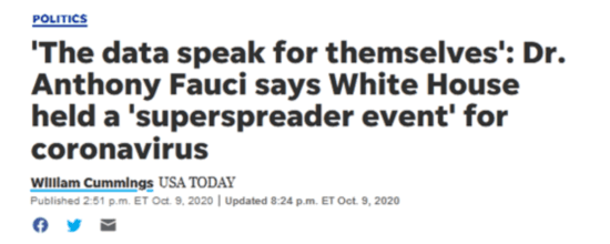 “我认为数据可以说明一切。”福奇表示,“白宫经历了一场超级传播事件,人们挤在一起,也没有戴口罩。”