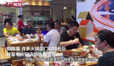 记者了解到,假期里,许多火锅店门口排起了长队,甚至有火锅店从开门起就一直排队至凌晨3点,渝中区一火锅店在国庆节8天排队突破2万桌之多,火热的场景、热闹似“过年”。