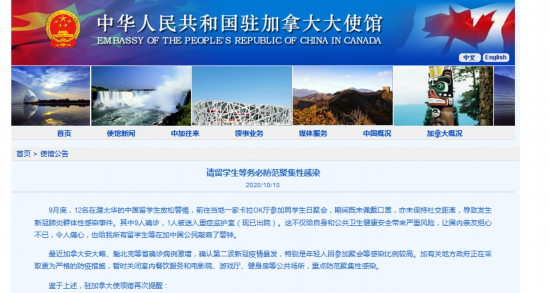 9月底,12名在渥太华的中国留学生放松警惕,前往当地一家卡拉OK厅参加同学生日聚会,期间既未佩戴口罩,亦未保持社交距离,导致发生新冠肺炎群体性感染事件。其中9人确诊,1人被送入重症监护室(现已出院)。这不仅给自身和公共卫生健康安全带来严重风险,让国内亲友担心不已,令人痛心,也给我所有留学生等在加中国公民敲响了警钟。