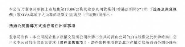 10月8日,香港中旅国际投资有限公司发布公告称,拟挂牌出售港中旅(登封)嵩山少林文化旅游有限公司的51%股权。