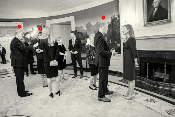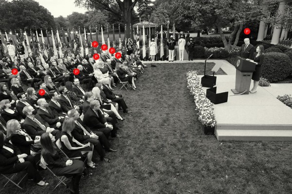 9月26日,白宫多人在室内交谈,没有戴口罩,也没有保持安全社交距离。图中被标记者皆已确诊新冠肺炎。(图片来源:《纽约时报》)