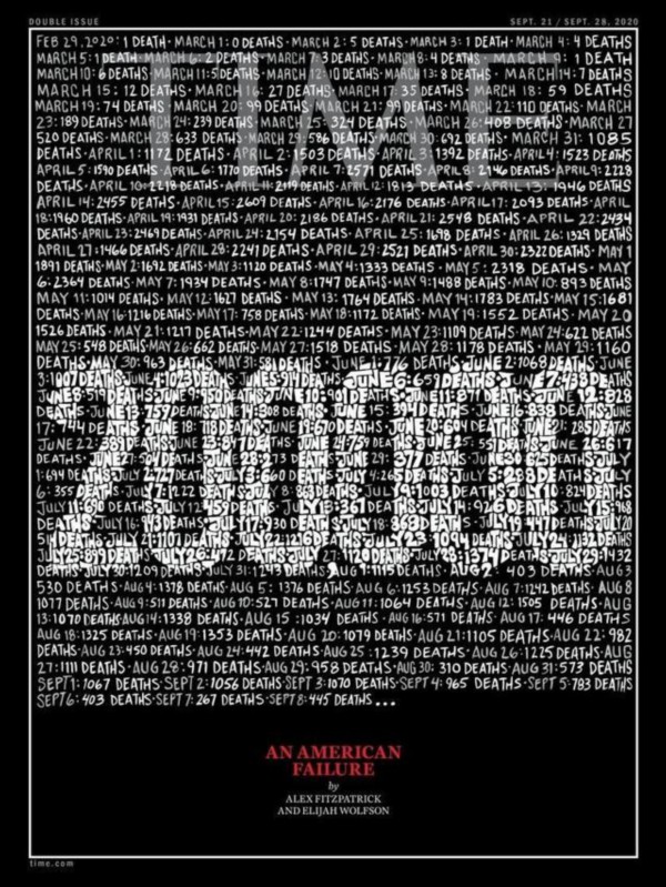 这已经不是《时代》周刊第一次在封面刊图讽刺白宫抗疫不力。9月10日,《时代》封面用美国每日死亡病例数组成“200000”的巨大数字,白字黑底,并在数字下方用红色字体醒目地标注:一场美国式失败(AN AMERICAN FAILURE)。