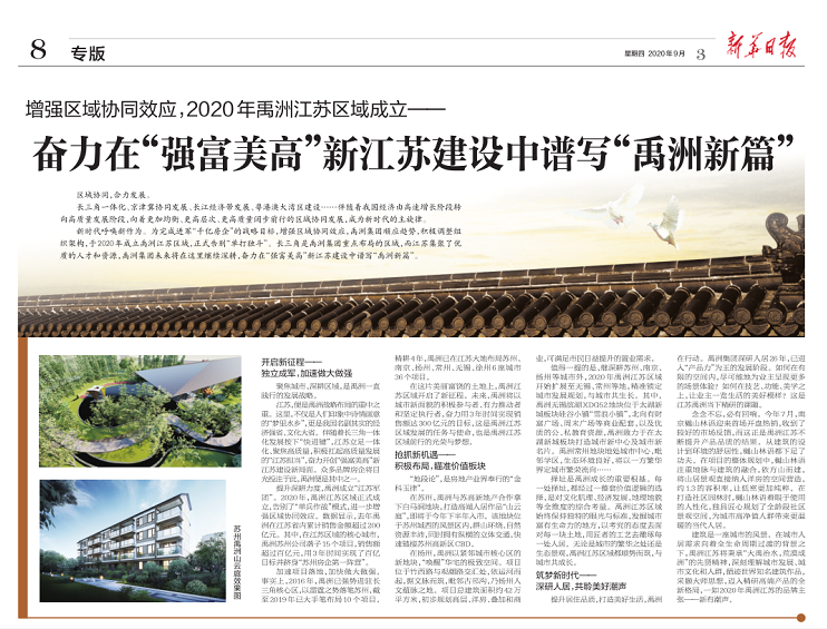 在这片美丽富饶的土地上,禹洲江苏区域开启了新征程。未来,禹洲将以城市新面貌的积极参与者、有力推动者和坚定执行者,奋力用3年时间实现销售额达300亿元的目标,这是禹洲江苏区域发展的任务与使命,也是禹洲江苏区域前行的光荣与梦想。