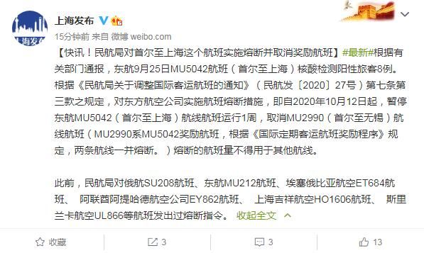 荔枝新闻讯 据上海发布官方微博10月10日消息,根据有关部门通报,东航9月25日MU5042航班(首尔至上海)核酸检测阳性旅客8例。根据《民航局关于调整国际客运航班的通知》(民航发〔2020〕27号)第七条第三款之规定,对东方航空公司实施航班熔断措施,即自2020年10月12日起,暂停东航MU5042(首尔至上海)航线航班运行1周,取消MU2990(首尔至无锡)航线航班(MU2990系MU5042奖励航班,根据《国际定期客运航班奖励程序》规定,两条航线一并熔断。)熔断的航班量不得用于其他航线。