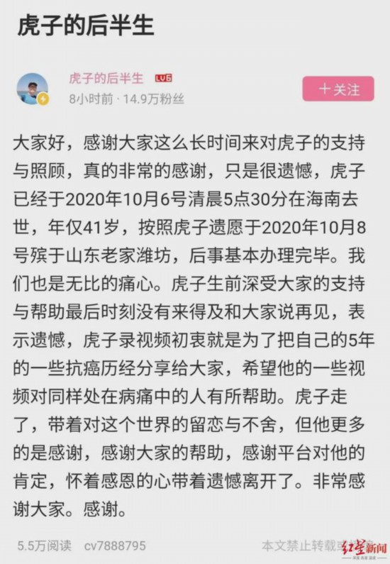 10月9日,颇具争议的抗癌博主“虎子的后半生”账号发布讣告称,虎子已经于2020年10月6号清晨5点30分在海南去世,年仅41岁。此前虎子曾连续发布视频记录抗癌生活,后被网友质疑花销巨大疑似卖惨。