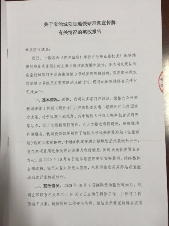 10月7日下午,章丘区住建局发现网络相关信息后,第一时间责令宝能城项目进行整改;