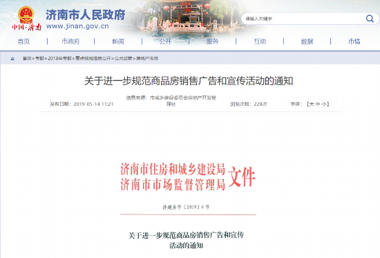 2019年5月,济南市住建局联合济南市市场监督管理局下发《关于进一步规范商品房销售广告和宣传活动的通知》,明确不得利用规划或在建中的学校、地铁作为楼盘卖点宣传,章丘区、济阳区、莱芜区、钢城区、商河县、平阴县参照通知一并执行。