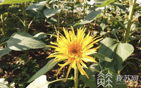此外,记者在现场看到,就在这株并蒂向日葵旁边,还有一株长得很像菊花的向日葵,也很特别。