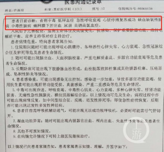 ▲病例显示,昏迷的许高双系食物中毒等所致。图片来源/知情人士提供