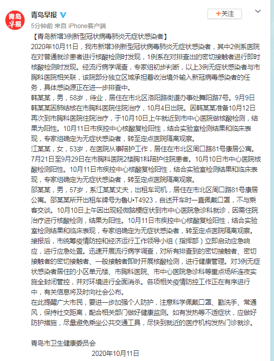 2020年10月11日,我市新增3例新型冠状病毒肺炎无症状感染者,其中2例系医院在对普通就诊患者进行核酸检测时发现,1例系在对排查出的密切接触者进行即时核酸检测时发现。经流行病学调查,专家组初步判断,以上3例无症状感染者与市胸科医院相关联,该院部分独立区域承担着收治境外输入新冠病毒感染者的任务,具体感染源正在进一步排查中。