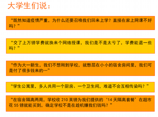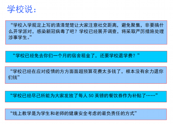 开篇说到的学生们关心的“退学费”问题,英国政府网站上是这么回复的:只要学生们能接受到足够的、质量较好的网上教学,就不存在“退学费”的情况。