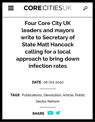 10月6日,曼彻斯特、利物浦、利兹和纽卡斯尔四个英国核心城市的市长联名致信英国卫生大臣汉考克,称政府现行的抗疫措施“不仅没用、让人迷惑、还起反作用”,呼吁中央政府采取本地化抗疫措施,以降低目前急剧蹿升的感染率。