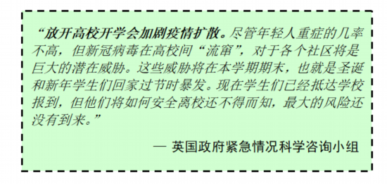 面对控疫情和保经济这两件事,英国政府一直在做艰难的平衡。英国疫情反弹让我们看到防控难度之大,简单的措施似乎很难控制到位。从传染病管控的角度,各个城市、各个学校应根据实际情况逐步放开,才能像其他部门一样回归正常。