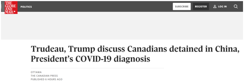 加总理办公室表示,特鲁多在通话中祝愿感染新冠的美国总统及其夫人一切顺利。特鲁多还回忆起今年3月自己的夫人感染新冠后收到来自美国总统的“关切”。通话内容显示,两位领导人还讨论了遏制疫情的努力。