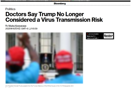 而白宫至今仍未透露特朗普的新冠检测是否以及何时转阴。据彭博社最新消息,白宫医生康利只是在当地时间10日的一份最新声明中称,特朗普已不再被认为有给他人传播新冠病毒的风险,符合安全中止隔离的标准。