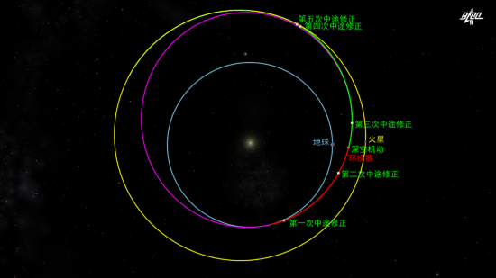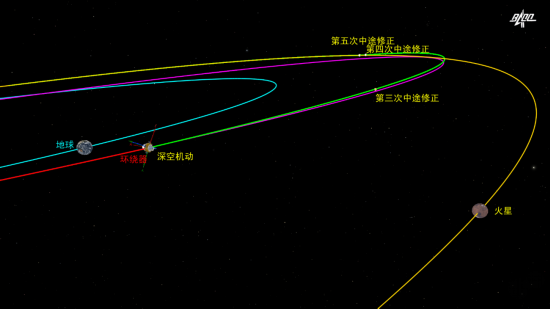 航天科技集团八院火星环绕器团队介绍,深空机动是指在地火转移段实施的一次变轨机动。通过深空机动可以改变探测器原有的飞行速度和方向,使其能够沿着变轨后的轨道顺利飞行至火星。
