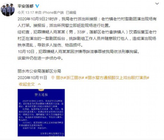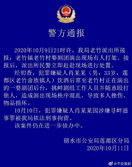 荔枝新闻讯 据丽水市莲都区公安分局官方微博@平安莲都 发布通报,2020年10月9日21时许,丽水市莲都区公安分局老竹派出所接报:老竹镇老竹村婺剧团演出现场有人打架。接报后,派出所民警立即赶赴现场进行处置。