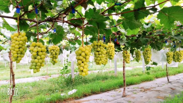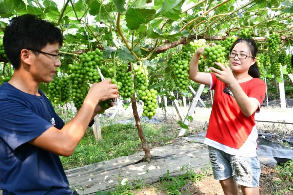 园主人是毕业于南京林业大学的返乡硕士夫妻,丈夫叫杨建,妻子叫徐娇。他们一边指点着十几名工人装箱,一边向来访者介绍:“现在采摘的葡萄是园里当家品种——阳光玫瑰,不但易储存,不掉粒,晶莹剔透,果实饱满,香甜可口,而且还带有一股浓郁的玫瑰花香,号称葡萄中的当家花旦,甜度平均达到20度以上。”