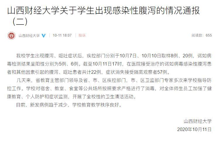荔枝新闻讯 据山西财经大学官方微博@山西财经大学 10月11日发布消息,山西财经大学学生出现腹泻、呕吐症状后,疾控部门分别于10月7日、10月10日取样8例、20例,诺如病毒检测结果呈阳性分别为5例、6例。截至10月11日17时,在医院接受治疗的诺如病毒感染性腹泻患者和其他因素引起的腹泻、呕吐患者共计22例,症状消失接受隔离观察者57例。
