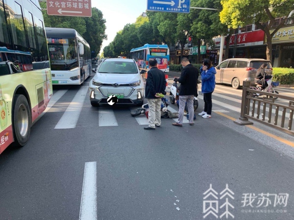 10月10日上午8时25分左右,杨某某(男,42岁)驾驶的苏KD18XXX号小型普通客车由南向北行驶至汶河南路扬州金店门前斑马线时,遇前方斑马线有多辆电动车过马路,杨某某停车让行后,正准备启动时,曹某某(女,19岁)突然驾驶的电动二轮自行车(车后座搭载一名16周岁以上的成年人)从西侧由西向东横穿马路,杨某某避让不及与曹某某发生碰撞。