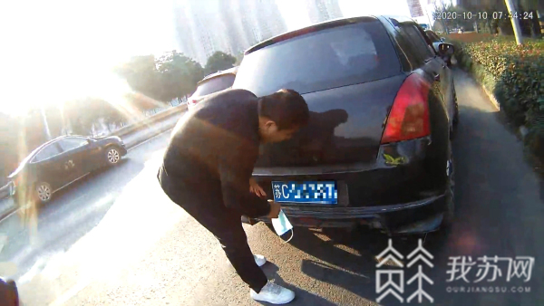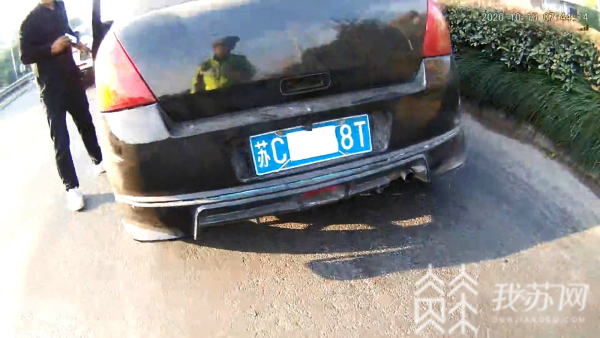 10月10日星期六,徐州泉山交警在早高峰执勤过程中,发现一辆正在行驶的黑色轿车前后车牌上各被“戴上”了一只口罩,民警立即将车辆拦下进行检查。