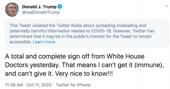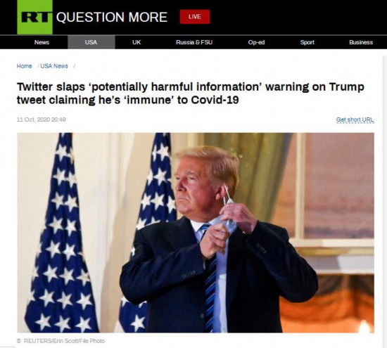 (RT:推特对特朗普称自己对新冠“免疫”的推文发出“潜在有害信息”警告)