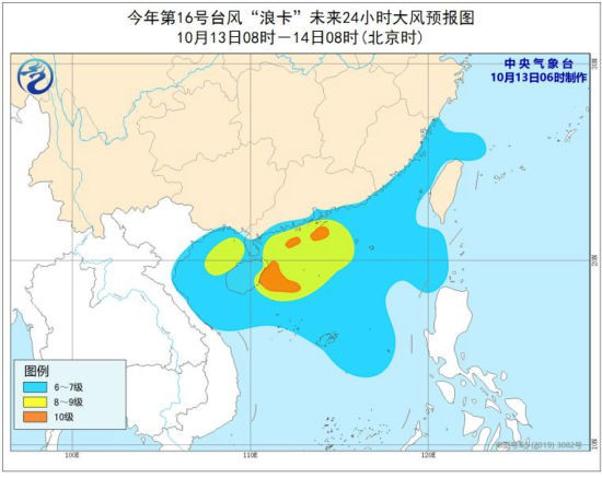 中央气象台10月13日06时继续发布台风黄色预警:今年第16号台风“浪卡”(热带风暴级)的中心今天(13日)早晨5点钟位于海南省万宁市以东大约300公里的南海北部海面上,就是北纬18.4度、东经113.2度,中心附近最大风力有9级(23米/秒),中心最低气压为990百帕,七级风圈半径250-350公里。