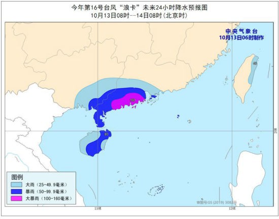 降雨预报:13日08时至14日08时,广东西南部、广西东南部和海南岛以及西沙群岛、中沙群岛等地将有大到暴雨,其中,广东西南部沿海局地有大暴雨(100-160毫米)。