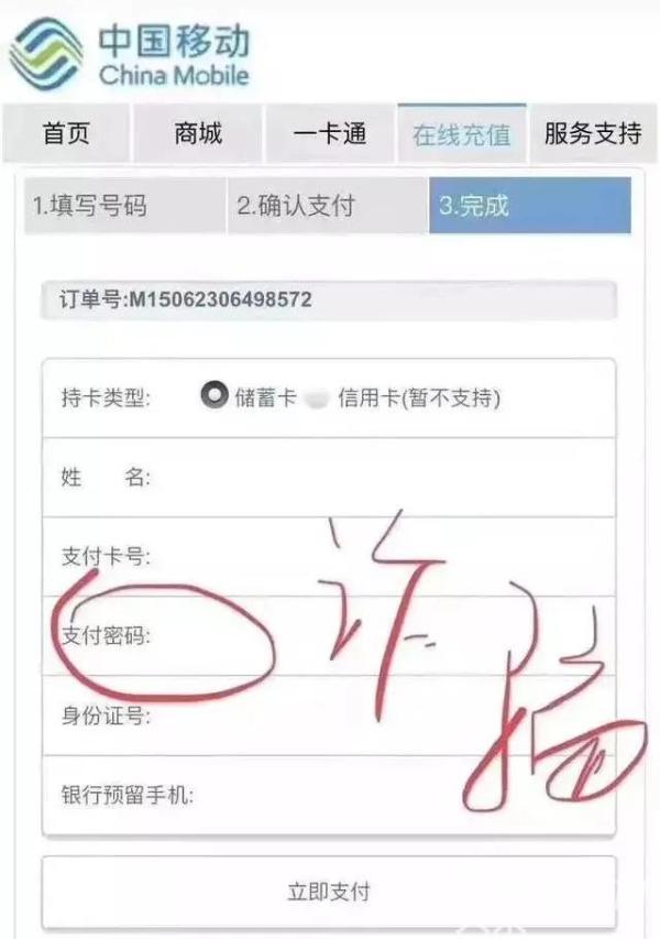 且慢!如果你足够细心,你应该可以发现,虽然该短信由“10086”发出,但其结尾处的[中国移动] 与官方短信结尾处的【中国移动】还是有明显不同的。假如你点进短信链接,它就会带你进入到一个充值界面,填写完手机号码等信息后,页面居然要你输入银行卡号、身份证号、支付密码!