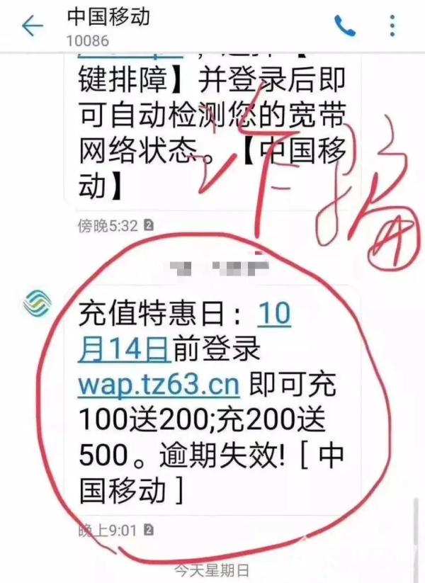 近日,有人陆续收到“中国移动”充100送200,充200送500的充值特惠活动短信。大家注意了!这是诈骗短信!这条显示来自于“10086”的短信息,实际上是诈骗分子利用伪基站和改号软件发出的诈骗短信,短信内链接的网页并非中国移动官方网站,而是诈骗分子制作的木马链接。