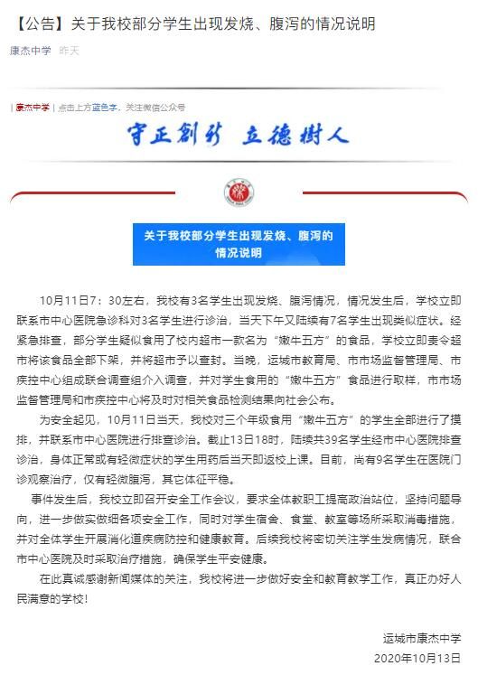 10月11日7:30左右,我校有3名学生出现发烧、腹泻情况,情况发生后,学校立即联系市中心医院急诊科对3名学生进行诊治,当天下午又陆续有7名学生出现类似症状。经紧急排查,部分学生疑似食用了校内超市一款名为“嫩牛五方”的食品,学校立即责令超市将该食品全部下架,并将超市予以查封。当晚,运城市教育局、市市场监督管理局、市疾控中心组成联合调查组介入调查,并对学生食用的“嫩牛五方”食品进行取样,市市场监督管理局和市疾控中心将及时对相关食品检测结果向社会公布。